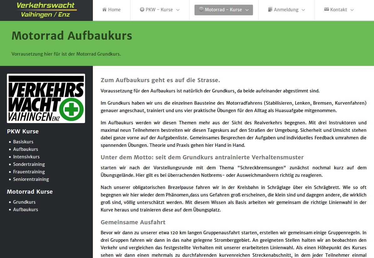 Wir sind als Veranstalter von Sicherheitstrainings (SHT), die führende Verkehrswacht in Deutschland. Seit 1971 veranstalten wir PKW-SHT, seit 1997 Motorrad-SHT mit bisher weit über 130.000 Teilnehmern. Jährlich werden unsere Kurse von bis zu 7.000 Teilnehmern besucht. Unser Übungsplatz verfügt über verschiedene Fahrbahnoberflächen für alle wetterbedingten Situationen, die vor allem Reifenverschleiß vermeiden. Die Verkehrswacht Vaihingen an der Enz bietet ein vielseitiges Kursangebot, durch unsere speziellen Kurse und die Unterrichtung in Fremdsprachen sind wir auch international bekannt. Wir verfügen über die erste Schleuderplatte in Deutschland und bieten eine individuelle Betreuung sowie notwendige Hilfe über Funkanlagen. Selbstverständlich führen wir auch Unfallverhütungstrainings der Verwaltungsberufsgenossenschaft durch. Nähere Informationen über http://www.vbg-fahrtraining.de Verpflegung ist in der Kursgebühr nicht enthalten (außer Brezel u. Kaffee am Vormittag). In der Mittagspause kann mitgebrachtes Vesper im Schulungsraum verzehrt werden, ein Kaltgetränkeautomat steht bereit. Gerne organisieren wir für Sie das Mittagessen in einer nahegelegenen Gaststätte oder über einen Party-Service.